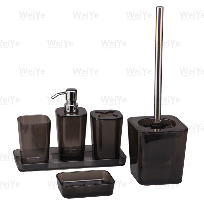 浴室用品套装方锥形系列6件套装包括:方锥形口杯、方锥形牙刷杯、方锥形液瓶、方锥形皂碟、方锥形马桶刷、方锥形托盘。耐用且质量上乘:这款5件套浴室用品套装由耐用塑料制成,比竞争产品更耐用。我们的高品质塑料浴室配件经久不衰,随着时间的推移保持优雅和新的外观。