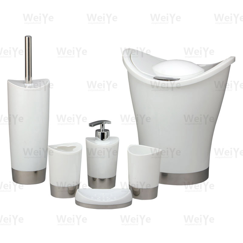 浴室用品套装元宝系列6件套包括:元宝口杯、元宝牙刷杯、元宝液瓶、元宝皂碟、元宝马桶刷、元宝垃圾桶。