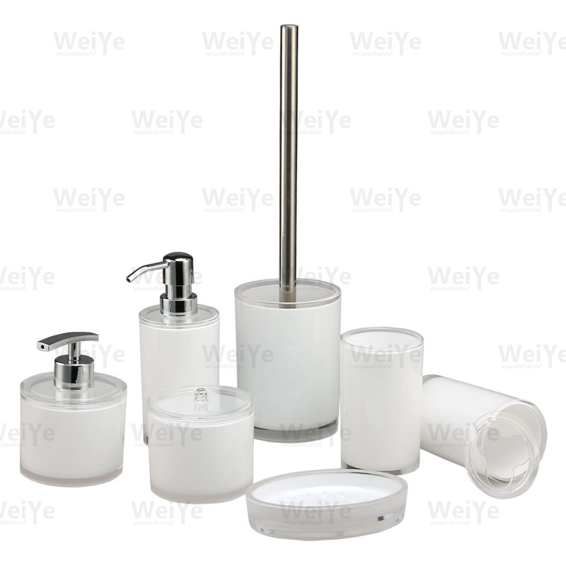 浴室用品套装圆柱形双色系列7件套包括:圆柱形双色口杯、圆柱形双色牙刷杯、圆柱形双色矮身液瓶、圆柱形双色高身液瓶、圆柱形双色皂碟、圆柱形双色马桶刷、圆柱形双色棉花罐。